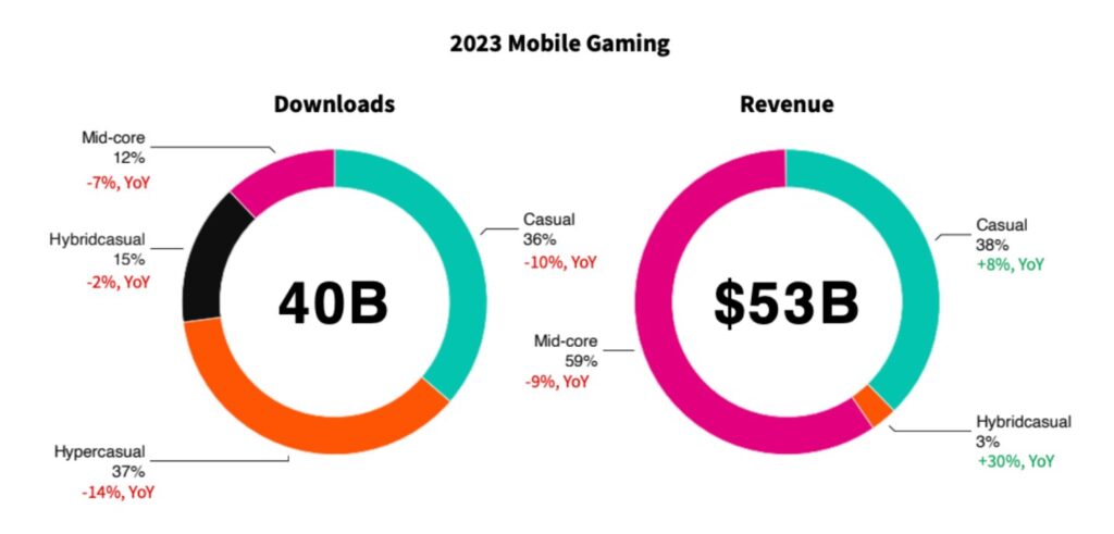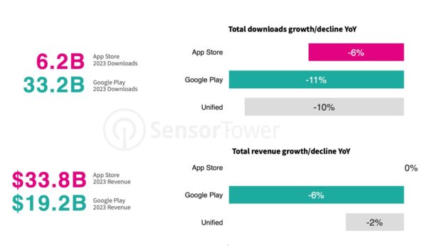 2023 nehéz év volt a mobiljátékok számára: mind iOS, mind Android platformokon csökkentek az összletöltések, különösen a Play Store-on.