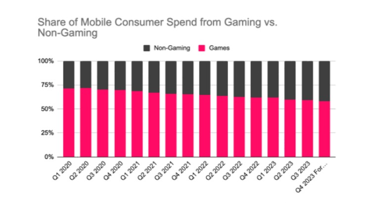 Egy másik fontos trend, ami az utóbbi években ütötte fel a fejét: Az alkalmazások egyre jobban felzárkóznak a játékokhoz bevételben, és 2030-ra várhatóan meghaladják őket.